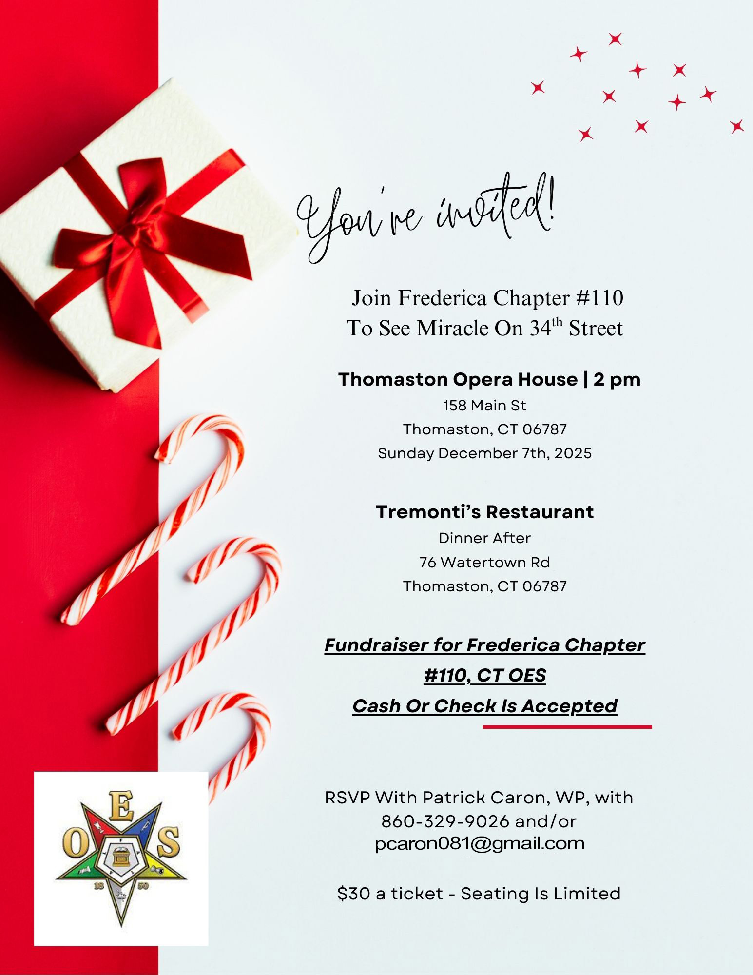 See flyer for details. Dinner is not included with ticket, but if folks are interested, a few are planning on going to Tremonti’s in Thomaston after the show and Patrick would need a count for those interested in joining those going to dinner….